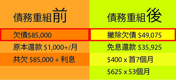 原本在60個月內一共需要付$36,000,每個月付$600。但是在新冠肺炎期間,因為何先生的收入大幅減少,負擔不了這個數,我們設計了一份能夠包容這個情況的債務重組建議書,首7個月改為每個月$400還款額。當何先生的收入恢復正常時,在剩下的53個月他的每月還款額將會是$625。