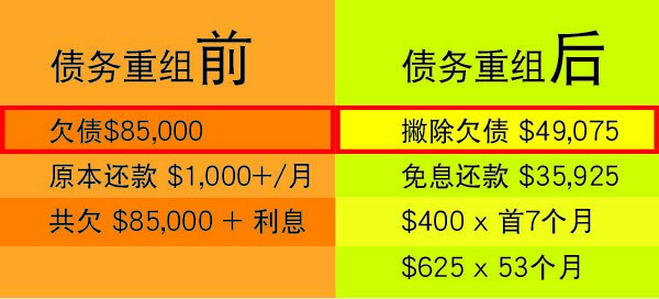 原本在60个月内一共需要付$36,000,每个月付$600。但是在新冠肺炎期间,因为何先生的收入大幅减少,负担不了这个数额,我们设计了一份能够包容这个情况的债务重组建议书,首7个月改为每个月$400还款额。 当何先生的收入恢复正常时,在剩下的53个月他的每月还款额将会是$625。